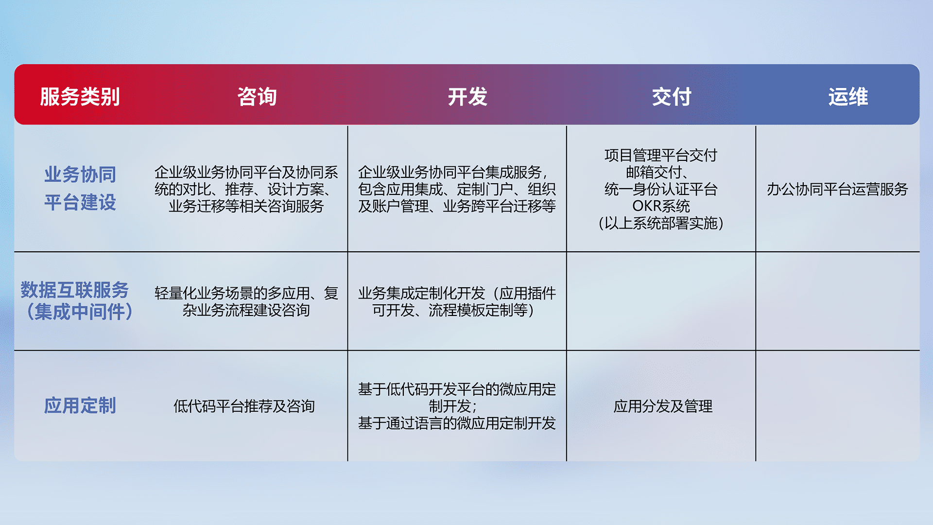 针对钉钉、、企微、、、IDaas等平台级产品提供产品的规划、、、、方案、、、、交付、、、定制化开发等服务,,实现如统一协同办公、、智能客户服务、、混合会议管理、、智能数据查询、、、等业务场景,,实现数字化转型。。。