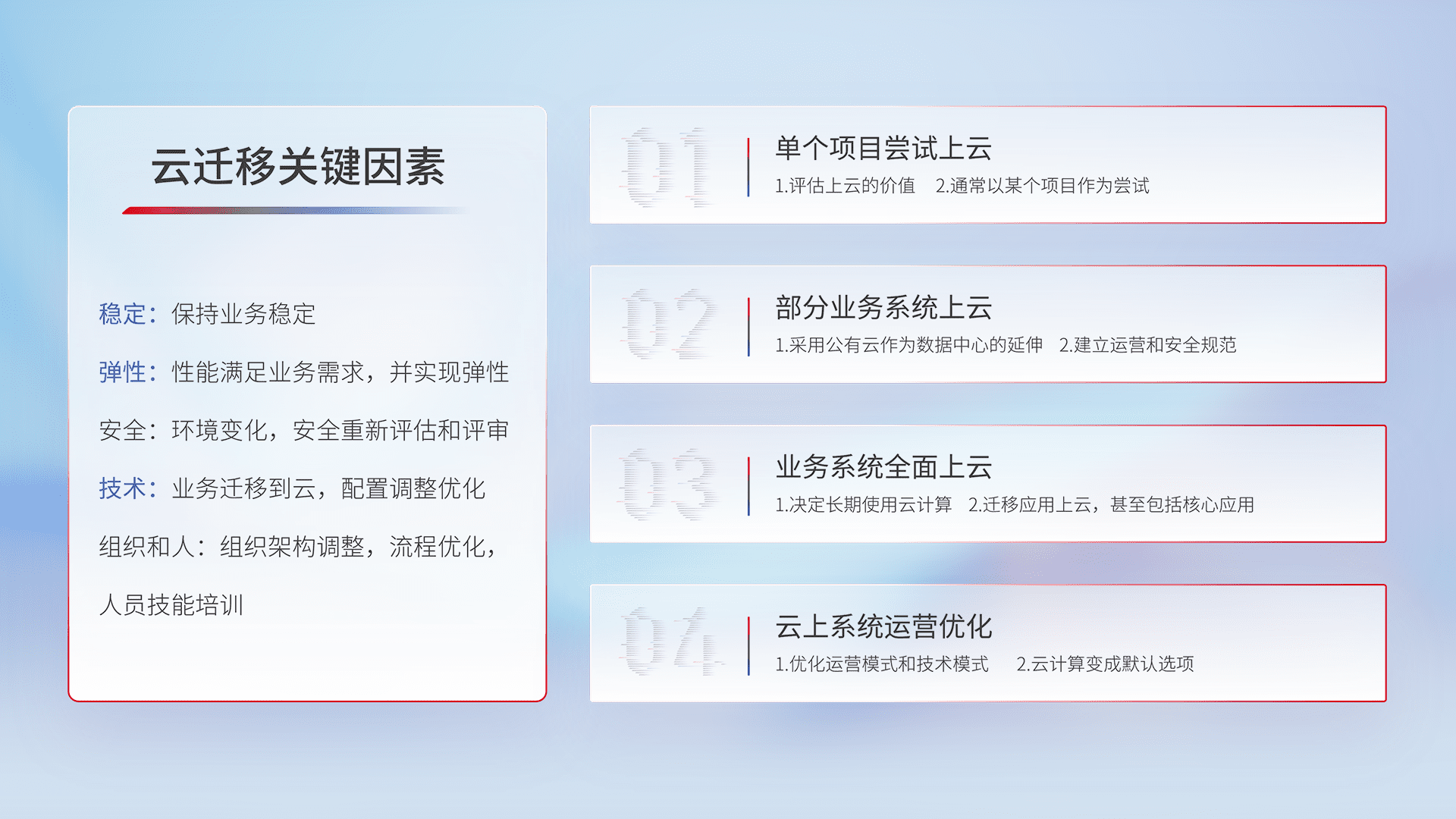 结合实际业务,,,从规划设计、、云平台选型、、、云原生改造、、、、数据迁移、、、集成交付,,,迁移全过程为客户识别最佳上云路径,,,,做好风险识别管理,,,,设计网络架构、、、、身份权限、、、、安全审计合规、、、、操作审计、、、、日志审计、、、监控告警策略、、、、多站点容灾设计等,,对云上基础设施进行整体规划,,,,提升IT治理水平,,,以满足弹性、、、高可用、、高性能的需求。。。