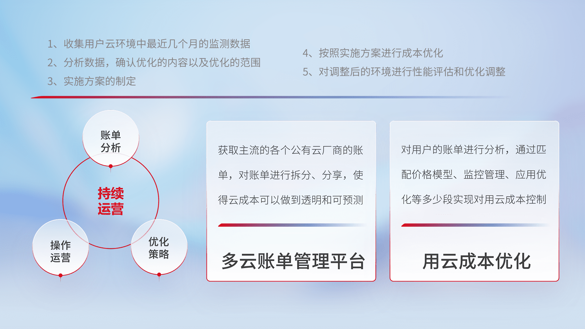 通过多云纳管,,以统一的资源数据模型把客户的云资源进行抽象和封装,,,进而实现对多云资源的统一操作,,保障云资源管理的可靠性、、稳定性与可用性。。。量身定制化运维内容,,,配置、、、开发运维、、、、补丁管理、、、备份、、、、监控、、认证和访问管理、、、、审计和日常巡检等,,,,保障在用云过程中的可靠度,,,稳定度以及高可用率。。。